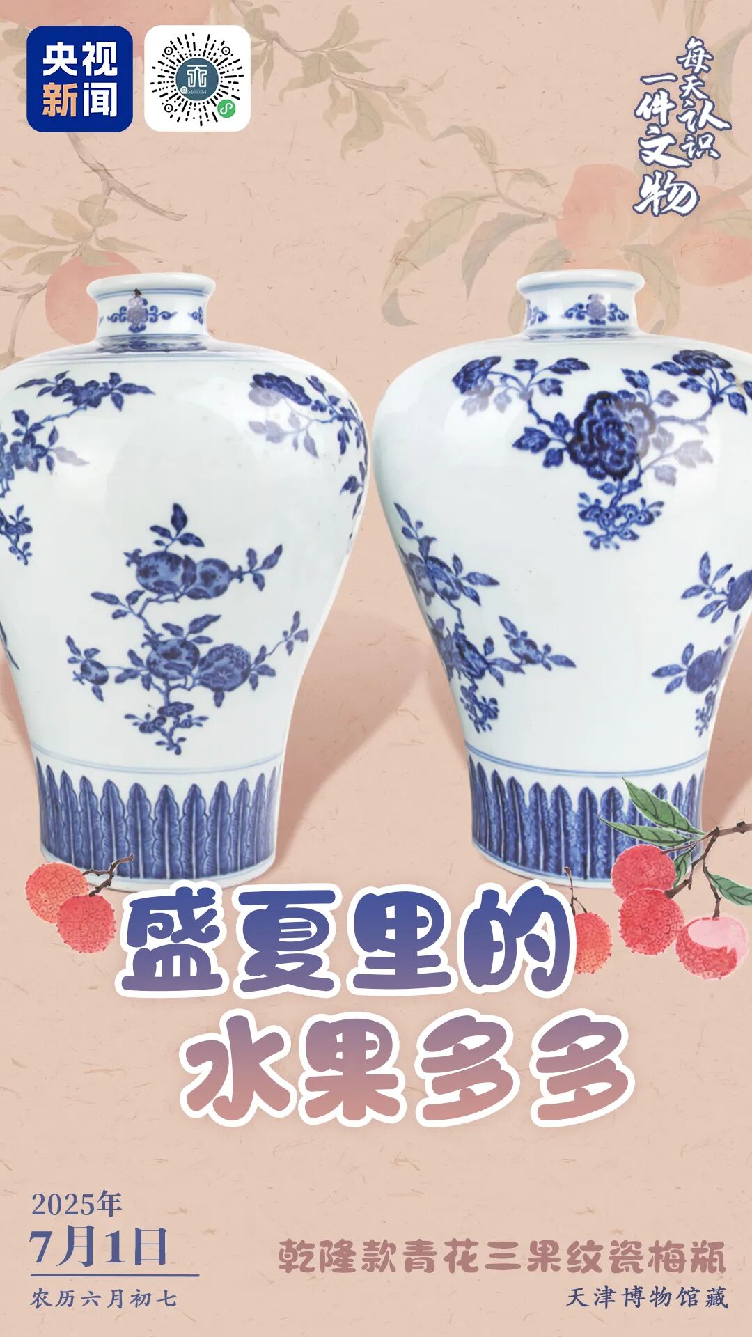 央视新闻联合全国博物馆推出文博科普产品《文博日历》,每天带你认识一件文物。乾隆款青花三果纹瓷梅瓶,瓶身外壁绘有荔枝、石榴、仙桃等折枝花果,每种花果之间点缀折枝花卉,颈部均饰一周十字花卉纹,肩部及圈足饰蕉叶纹。花卉芬芳盈枝,风姿绰约,果实饱满丰硕,寓意吉祥。识别图中小程序查看详情↓