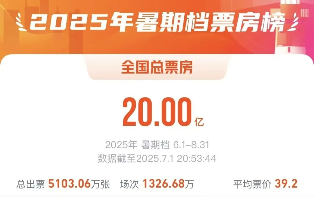 据网络平台数据,截至1日晚间,2025年暑期档(6月—8月)总票房(含预售)突破20亿。