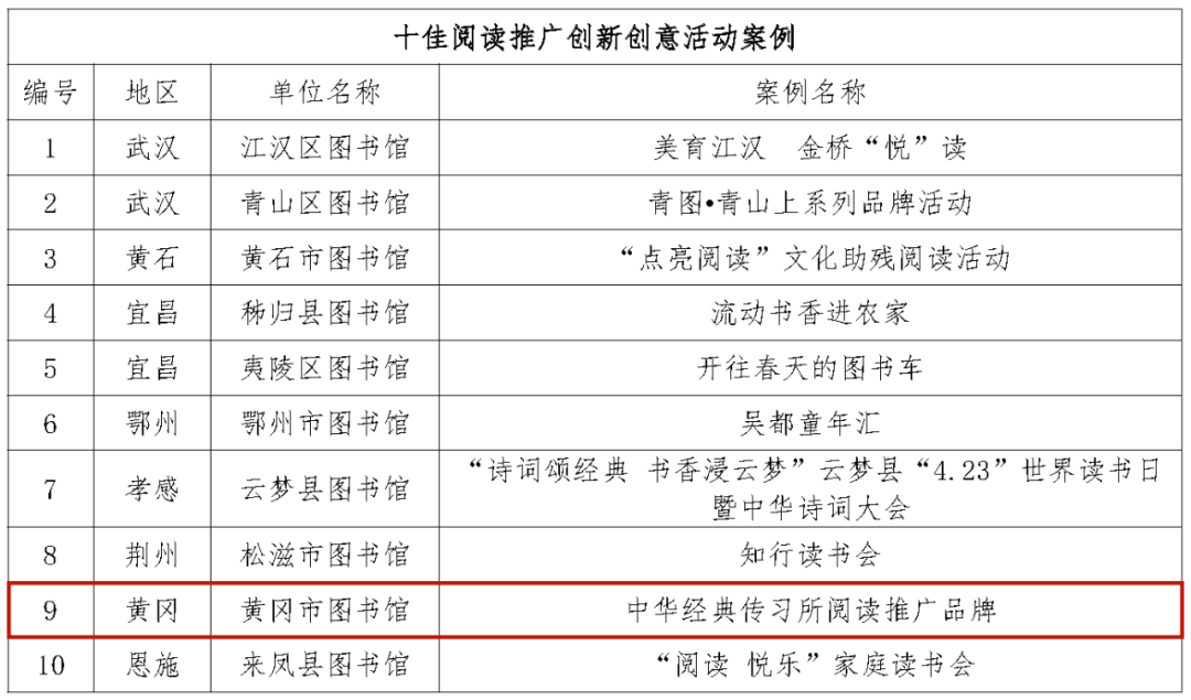 黄冈市图书馆荣获“十佳阅读推广创新创意活动案例”