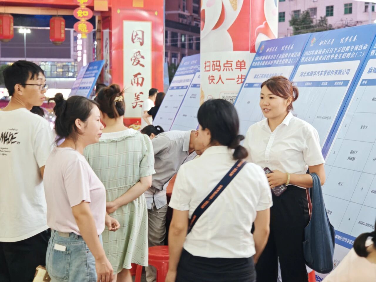 双线融合:专项招聘“赋能”,激活人才蓄水池。9月7日至8日,市人社局在麻城广场举办2025年第二期“百日千万招聘”夜市专场暨高校毕业生招聘会。活动融合线下面对面交流和线上直播互动,共组织30余家企业现场招聘,抖音直播间同步带岗。两天内吸引1.7万人次线上观看,500余人到场咨询,最终128人达成初步就业意向,有效为重点企业引进专业技能人才。