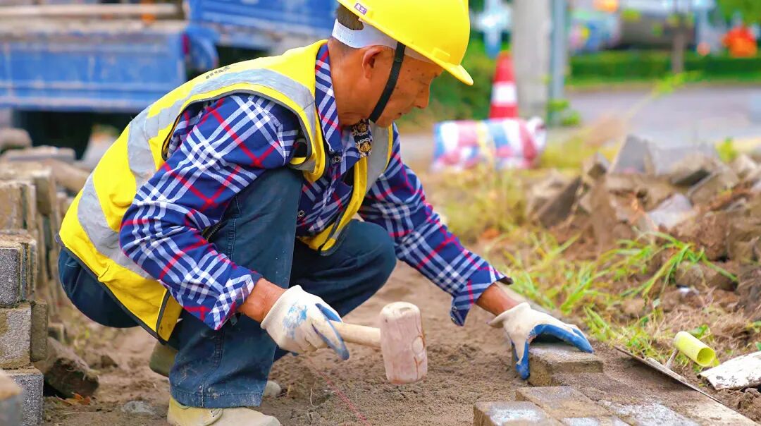 在民主大道北段的人行道上,市政维修工人蹲在地上,手持工具敲打着新铺设的砖块。