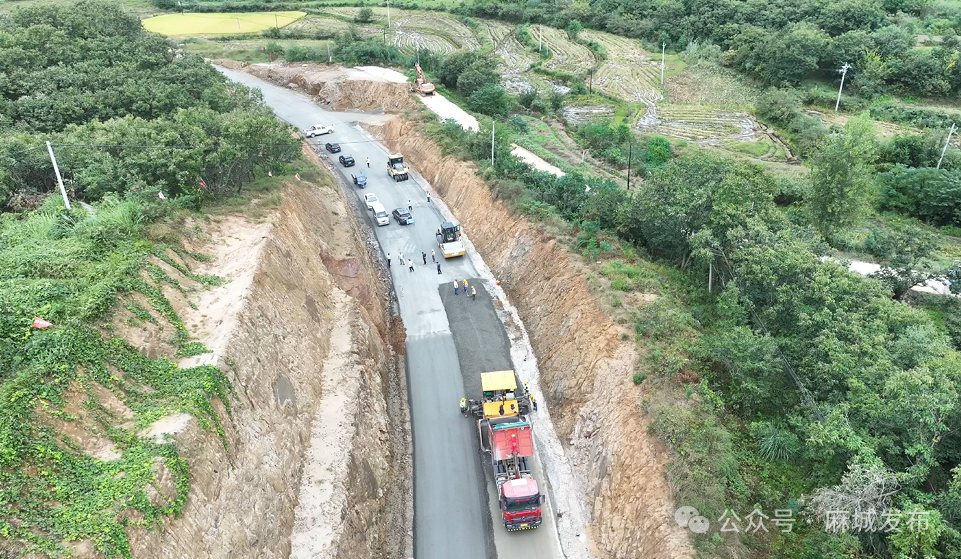 在三河口镇G220麻城市商家垸(鄂豫界)至边店段新建项目现场,2台摊铺机徐徐推进,4台压路机来回碾压,工程稳步推进中。