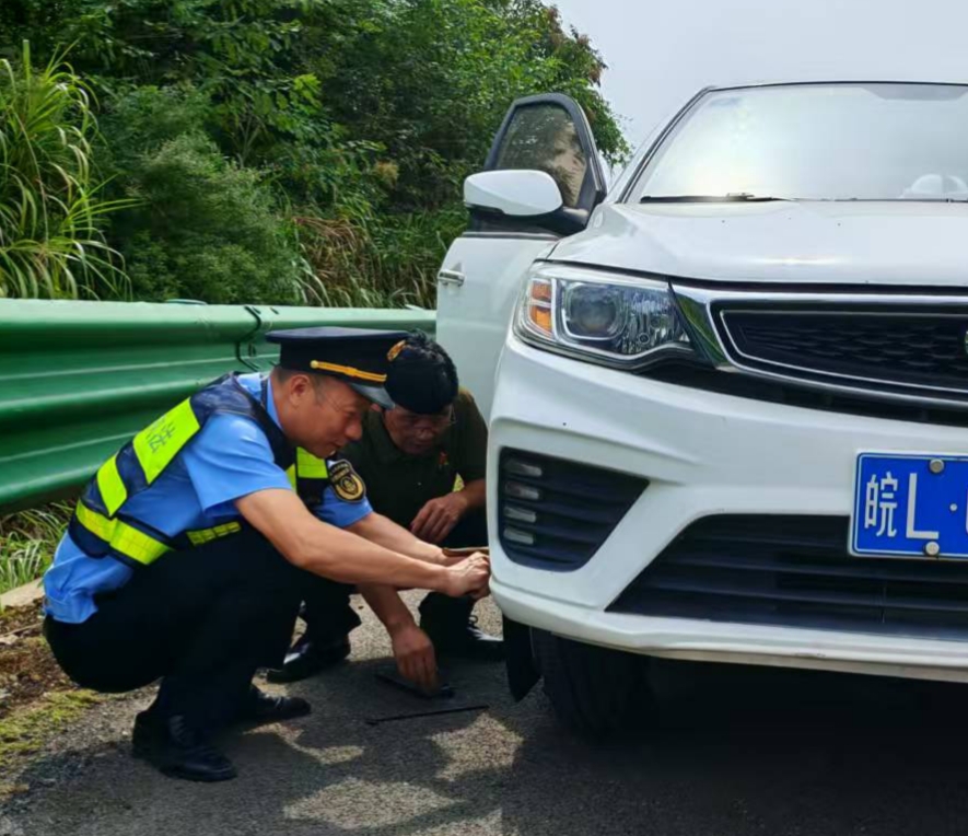 7日10:40,执行保畅任务的一支队六大队执法人员在开展巡查时,发现沪渝高速公路黄黄段蕲春境内沪渝向K766+500M红旗岗互通匝道附近时一辆车牌号为皖L的白色小轿车停在匝道的路肩处,司机正焦急地在右前轮处摆弄着。路政人员立即停车查看情况,经询问得知该车一家人今天早晨从安徽出发前往湖南省长沙市,可能是因为天气太热,我的车子右前轮突然爆胎,本来想把备胎换上,发现车上换胎工具也不齐,都不晓得该怎么办才好。路政人员迅速安排故障车人员到钢板护栏外等候,一名路政人员在车后方警戒、一人连忙拿上巡逻车上的工具帮助车辆更换轮胎,不到20分钟,车辆轮胎安装完毕。司机李师傅对路政人员的帮助感激不已,又因不熟悉路线,希望能被带到蕲嘉高速管窑停车区,在管窑停车区执法人员耐心地用手机为他导航,司机在管窑停车区稍作休整,这才自行驾车驶离高速。