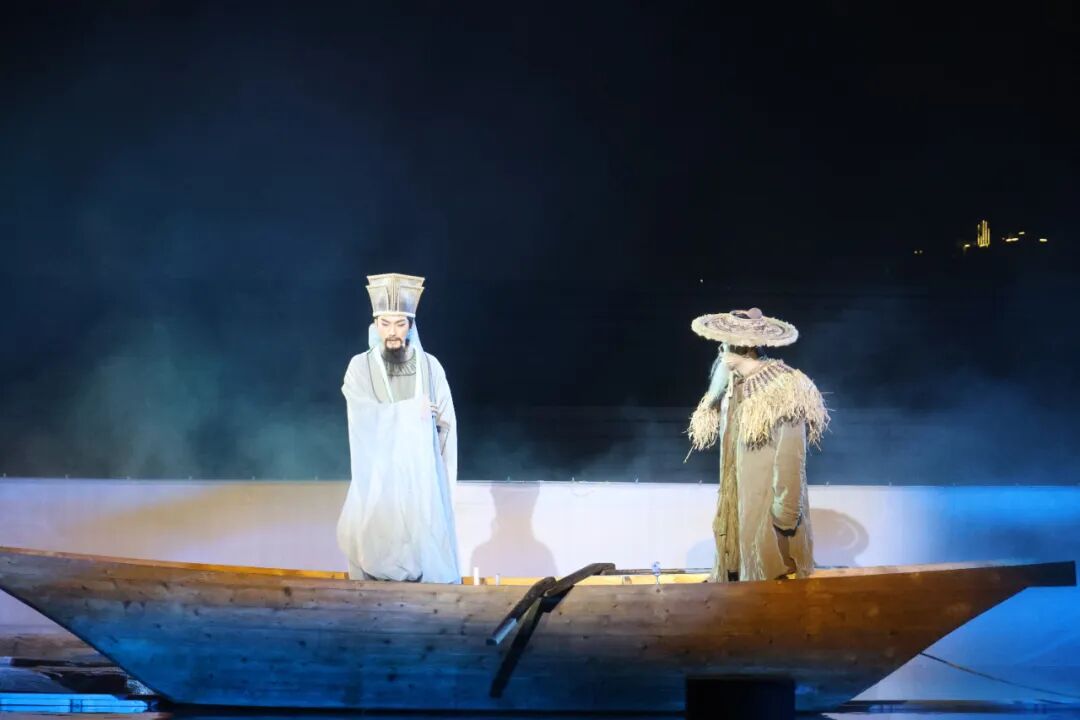 若说《从此东坡》是“水上东坡”,江山明月剧场的《大江东去》便是“山水间的东坡”。剧场借鉴宋画,20米高假山舞台与复刻的东坡赤壁二矶头,让观众直面“江山如画”。“会挽雕弓如满月”吟唱时,舞台上方烈焰如赤龙破空,将豪迈具象为视觉奇观。
