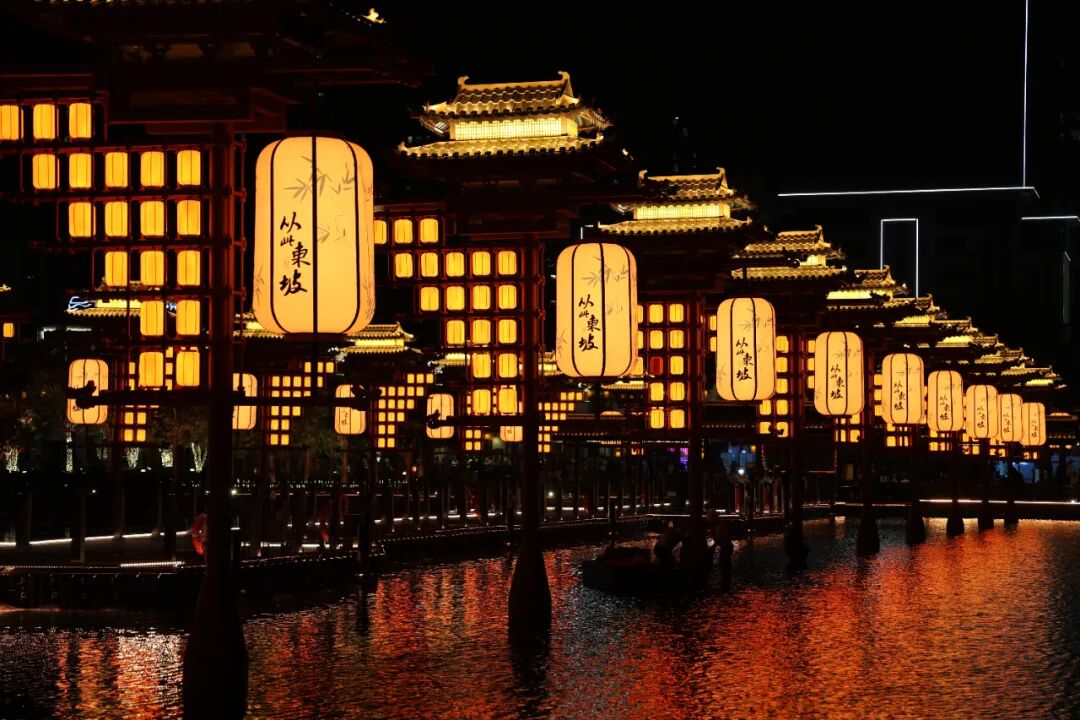 作为全国首个东坡文化沉浸式夜游项目,《从此东坡》以4公里游船航线串联“梦回大宋”“乌台诗案”“赤壁怀古”等8大场景。“乌台诗案”场景中,22米机械卷轴随船展开,暗色调与低沉配乐还原苏轼低谷;“赤壁怀古”处,三组战船残骸舞台与水秀装置组成“幻帆矩阵”,搭配“大江东去,浪淘尽”雄浑吟诵,再现“乱石穿空,惊涛拍岸”意境。