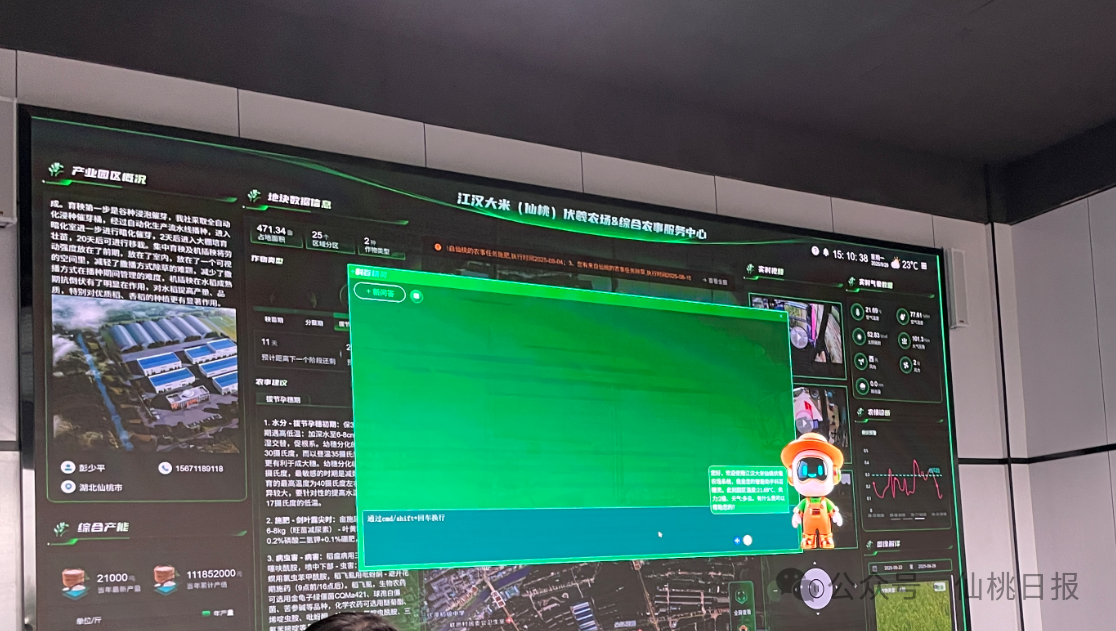 “欢迎光临仙桃江汉大米伏羲农场,风力二级,天气多云……”电子大屏上,AI精灵助手播报完天气,农场巡护人员发出“启动无人机巡检任务”的指令。