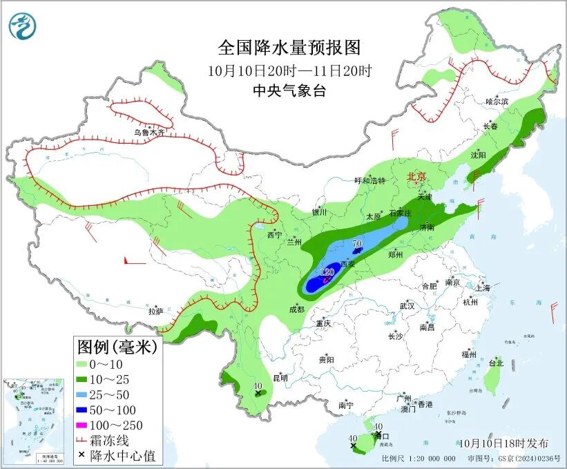 中央气象台10日18时继续发布暴雨蓝色预警,预计10日20时至11日20时,四川盆地西北部、甘肃东部和南部、陕西中部和南部、山西南部、河北南部等地的部分地区有大到暴雨,其中,陕西南部、四川盆地西北部等地局地有大暴雨。