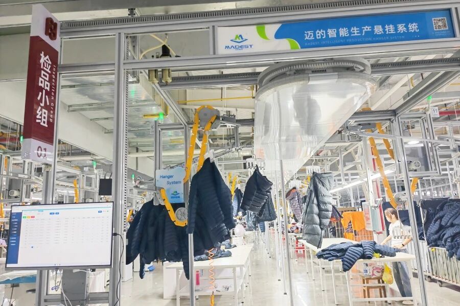 在缝制环节,数字化吊挂流水线系统成了“效率神器”。裁片通过扫码自动分配至对应工位,工人无需起身搬运,只需专注于单一工序。“以前车间里到处是拖货的拖车,现在吊挂系统自动送料,效率提升20%。”潘淑君说,更关键的是,以前一个人要负责整件衣服,现在每个人只负责一部分,长年累月下来就愈加熟练,工作效率大大提高。而且,系统能实时统计每个人的生产数据,避免了传统“计件模糊、统计耗时”的问题。