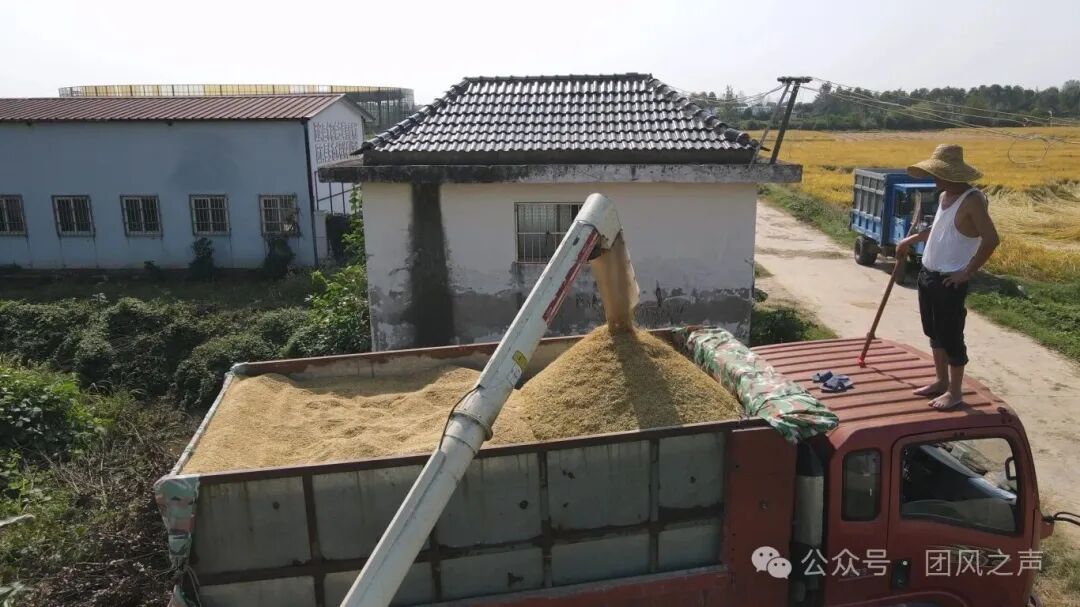 团风镇黄湖社区广阔的稻田里,数台联合收割机轰鸣作响,往来穿梭,勾勒出一幅繁忙的丰收画卷。已“低头弯腰”的稻谷经过收割机的处理,变身金灿灿的稻粒,顺着传送带落入路旁的运输机车。颗粒撞击铁斗的“哗啦啦”声,混着收割机的轰鸣声,为这场“战役”增添士气。