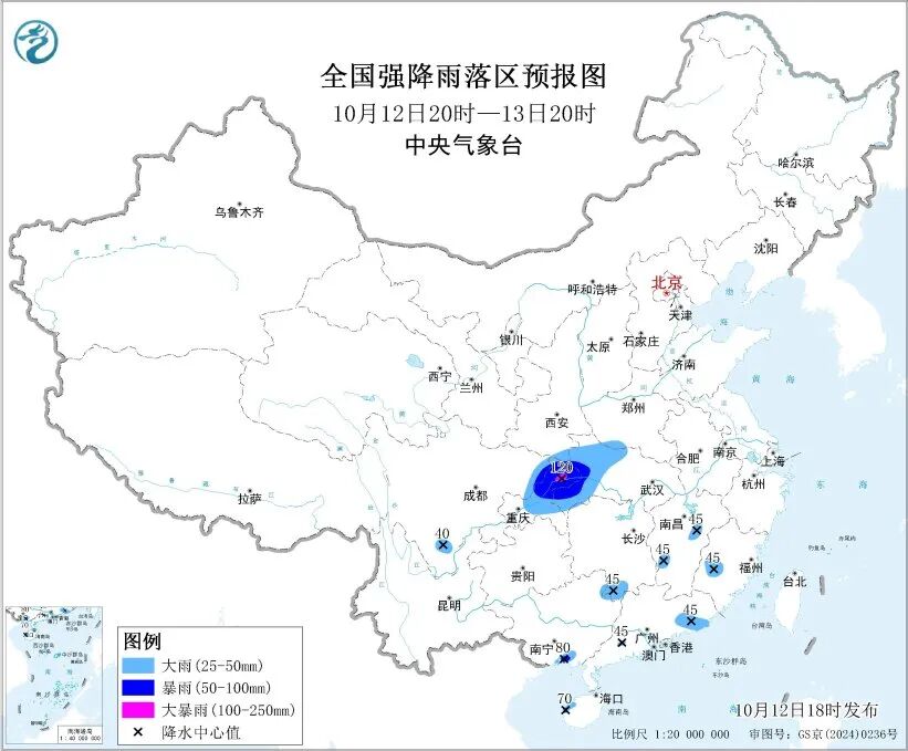 中央气象台12日18时继续发布暴雨蓝色预警,预计12日20时至13日20时,陕西东南部、四川东北部、重庆中北部、湖北西部、河南西南部等地的部分地区有大到暴雨,其中,重庆北部等地局地大暴雨。另外,广东东部和西南部、广西南部、海南岛西部、湖南南部、江西南部和东部、福建西部等地局地有大雨或暴雨。