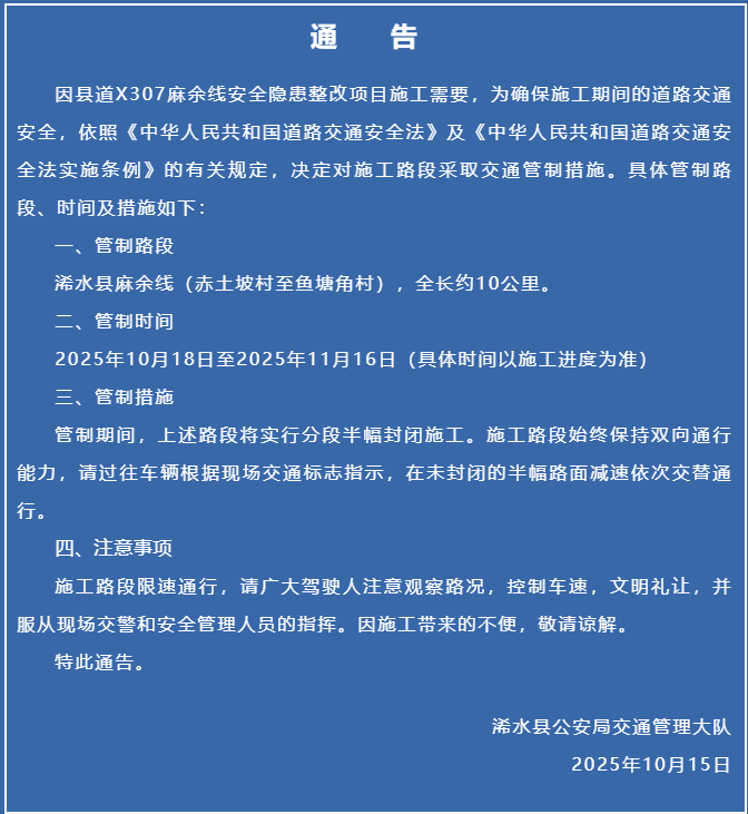 因县道X307麻余线安全隐患整改项目施工需要,明天起对施工路段实施交通管制。