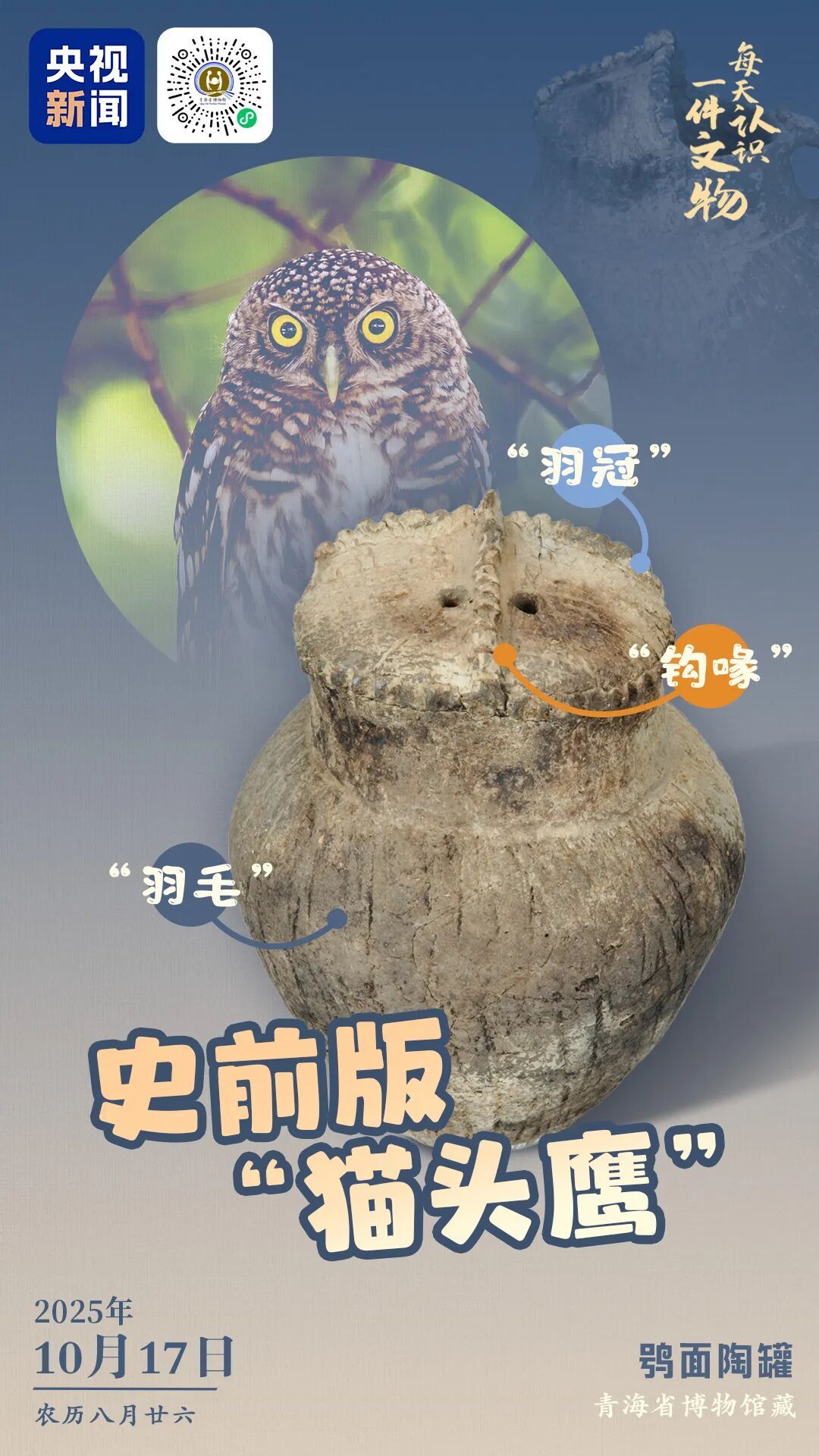 鸮面陶罐,收藏于青海省博物馆。这只陶罐的敛口部捏塑成圆弧面,正中穿两个圆孔,颇似两只眼睛,罐身通体装饰绳纹,远观好似毛茸茸的羽毛,整个器物造型将猫头鹰蹲踞时的神态捕捉得淋漓尽致。鉴于鸮面陶罐耐火性很强的材质特点,再加上整个罐体烟熏痕迹严重,专家们判断它可以用作烧煮的器物。