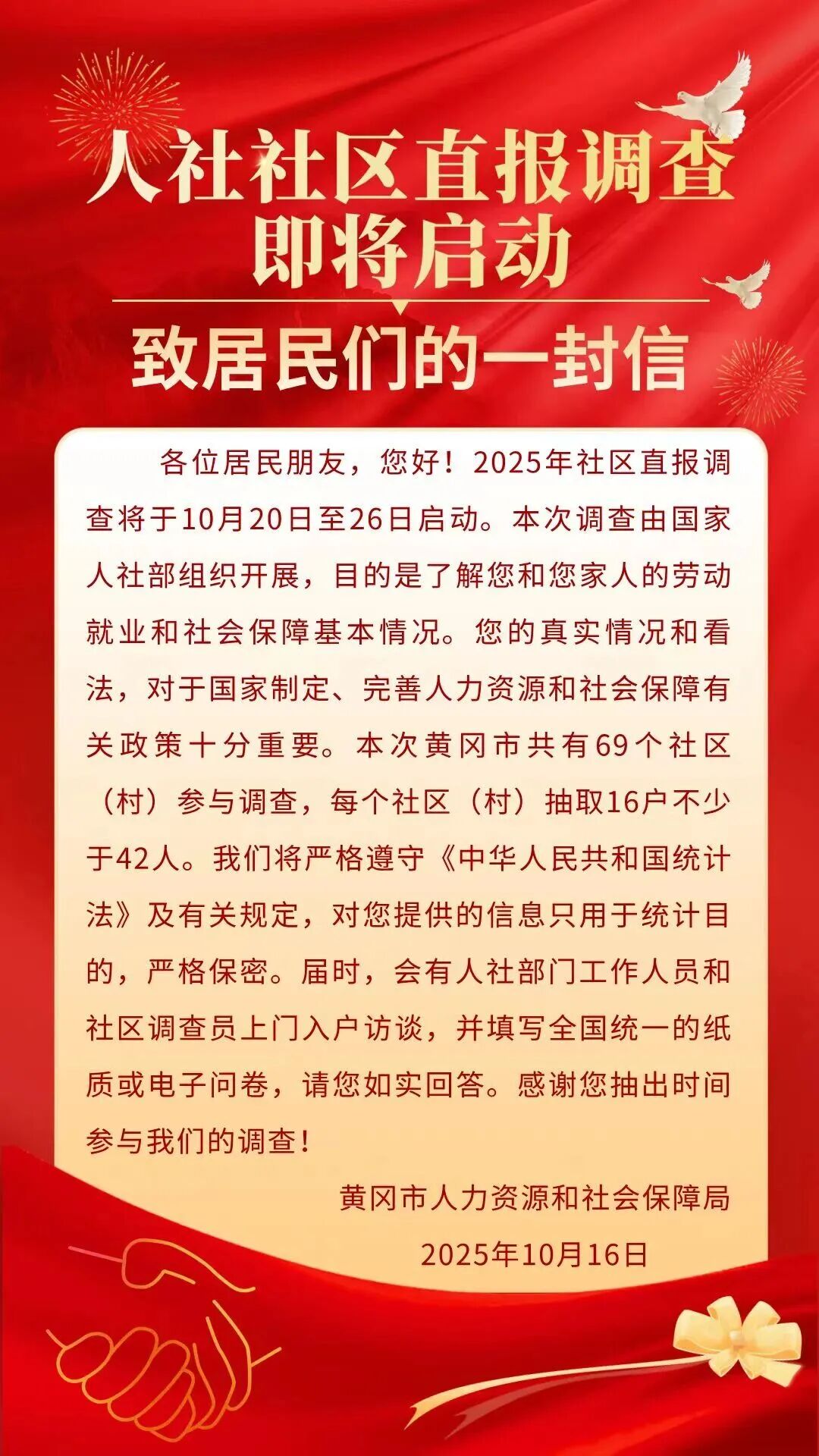 2025年社区直报调查将于10月20日至26日启动,由国家人社部组织开展,目的是了解劳动就业和社会保障基本情况。本次黄冈市共有69个社区(村)参与调查,每个社区(村)抽取16户不少于42人。