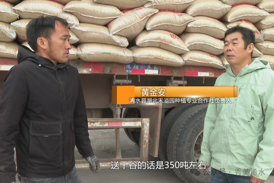 现场声:一天烘湿谷420吨,送干谷350吨左右。这个车一趟大概是拖46吨谷子。