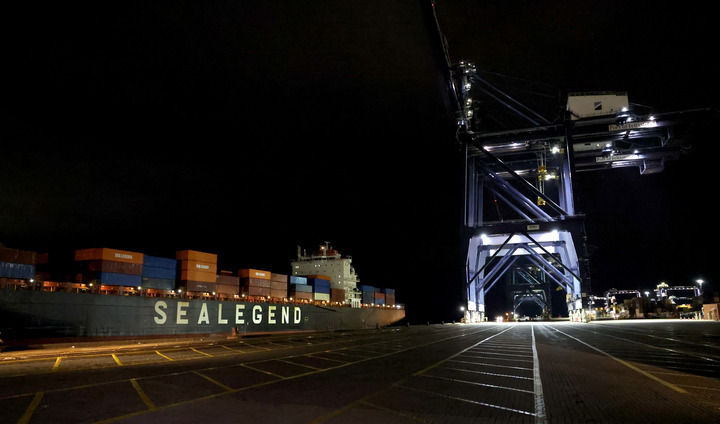 2025年10月13日,在英国费利克斯托港,中欧北极快航航线首艘货船驶入码头。新华社记者 李颖 摄