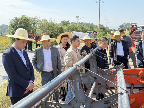 在蕲春县酒铺村再生稻生产基地,参会人员集体参观了农机设备,现场观摩再生稻机收减损关键技术与操作规范,参观再生稻机收减损田间作业演示及机收减损预测。
