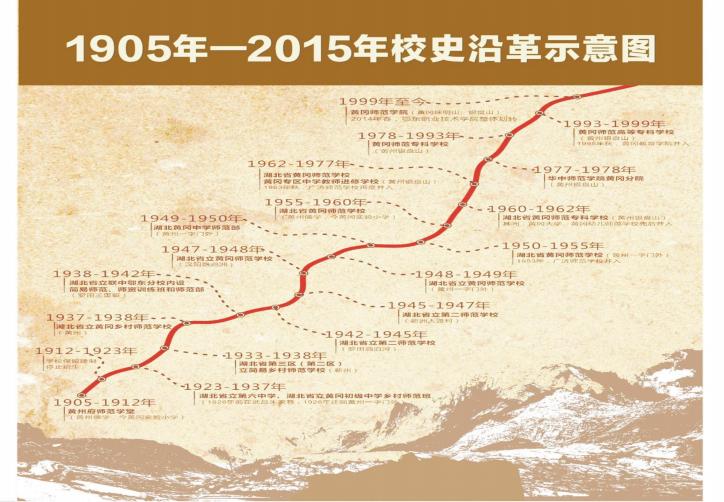 120年的黄师史,是一部志存高远、开拓进取的历史。从黄州到武汉、到罗田,120年的每一次辗转,都是一次血与火的淬炼;到儒学、到一字门、到银盘山、到珠明山,120年间每一次搬迁,都是一次事业的壮大和腾飞。有学者说过,中国每一所历史超过百年的高校,都是一部中国近代史的活化石,都记录着百年来中华民族的抗争和奋斗,都沉淀着百折不挠、奋发向上的民族精神。