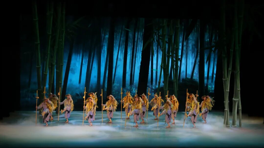 作为东坡“一词两赋”的诞生地,黄冈的东坡印记贯穿演出全程。剧目艺术表达以“诗为魂、舞为韵、乐为声”。一幕“明月几时有”以婉转深情的唱腔彰显家国情怀;二幕“一蓑烟雨任平生”用刚柔舞姿铺展豁达人生;三幕“我本海南民”则以温暖乐曲与细腻舞蹈,展现苏东坡与当地百姓的深厚情谊,诠释其“此心安处是吾乡”的民本初心。尾声“不老的东坡”主题曲将东坡先生的文脉与情怀永续传唱。音乐与舞美的匠心设计亮点纷呈。尤其在“一蓑烟雨”场景中,赤壁矶水墨影像随舞步渐次晕染,与演员洒脱的肢体语言相得益彰,将东坡在黄冈完成的文化突围具象化呈现,精准呼应二赋堂前“才子重文章,凭他二赋八诗”的楹联意境。