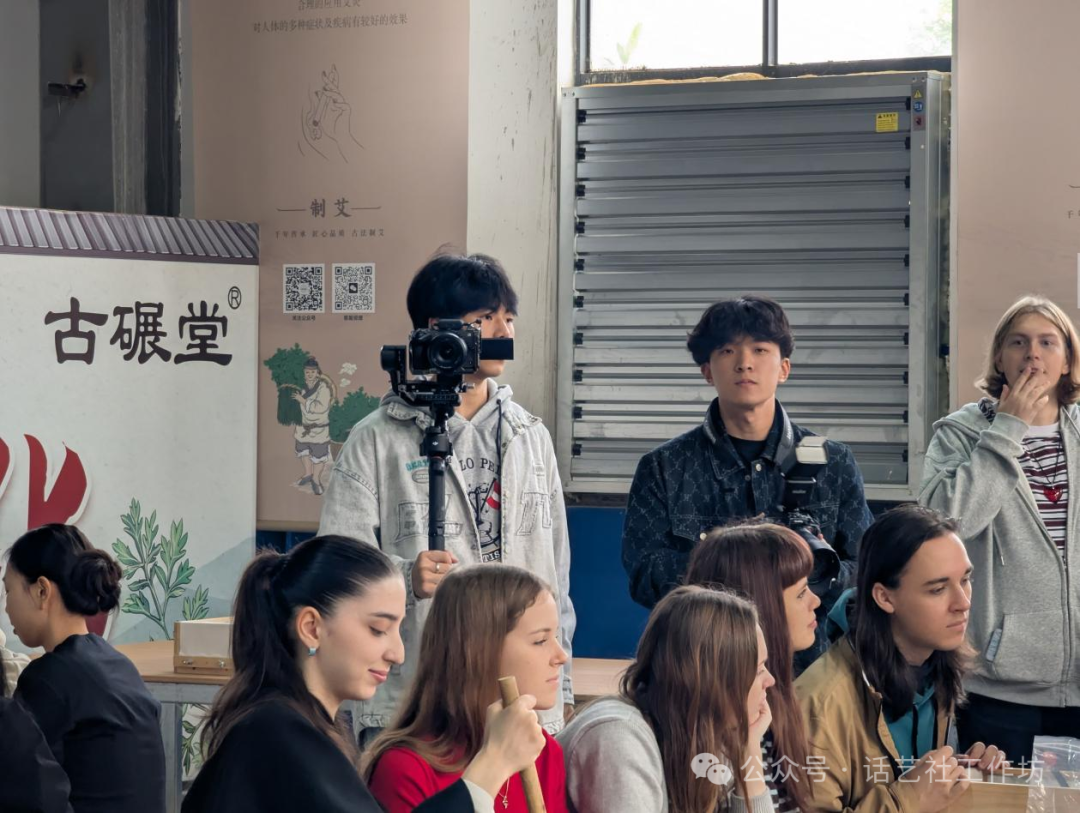转战蕲艾园,空气中弥漫着艾草的清香。留学生们一边聆听推普队员讲解《本草纲目》中“蕲艾自成化以来,以蕲州者为胜”的记载,一边亲手体验艾条的制作过程。