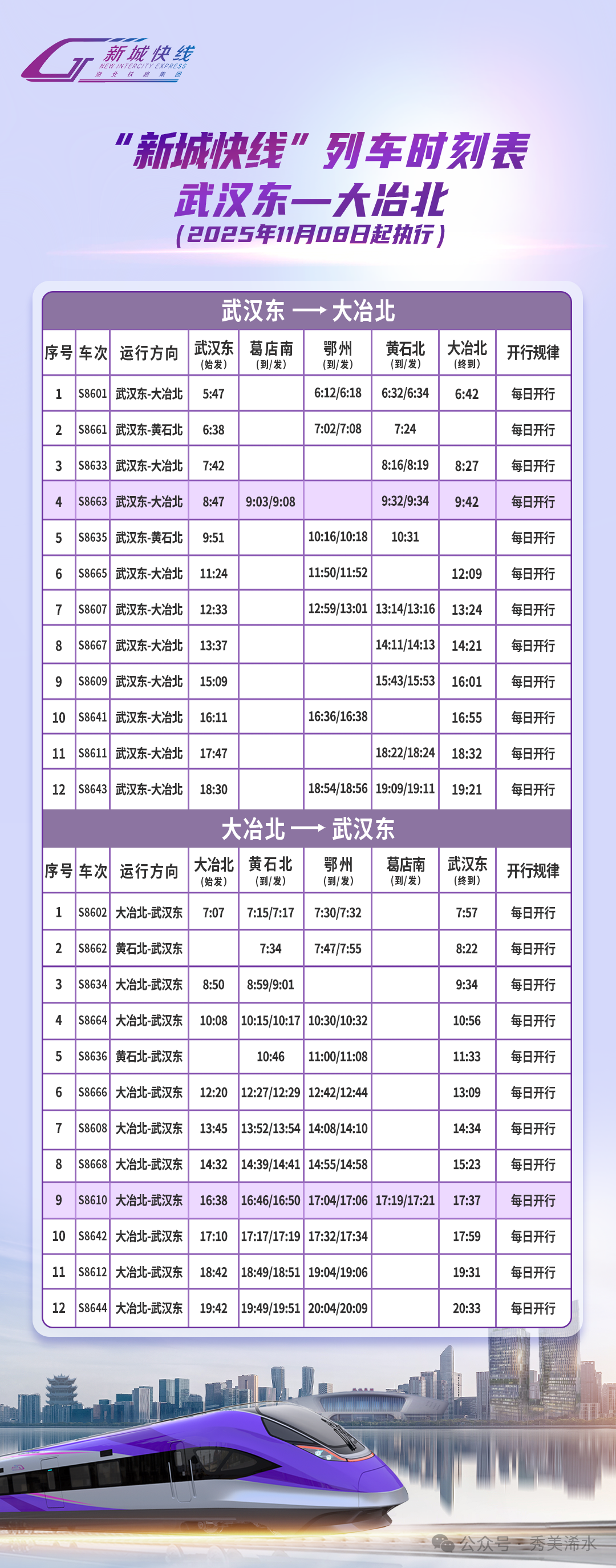 根据武汉局集团公司最新通知,“新城快线”葛店南站将于2025年11月8日正式开始办理客运业务,每日有4列“新城快线”列车停靠葛店南站,具体车次信息如下: