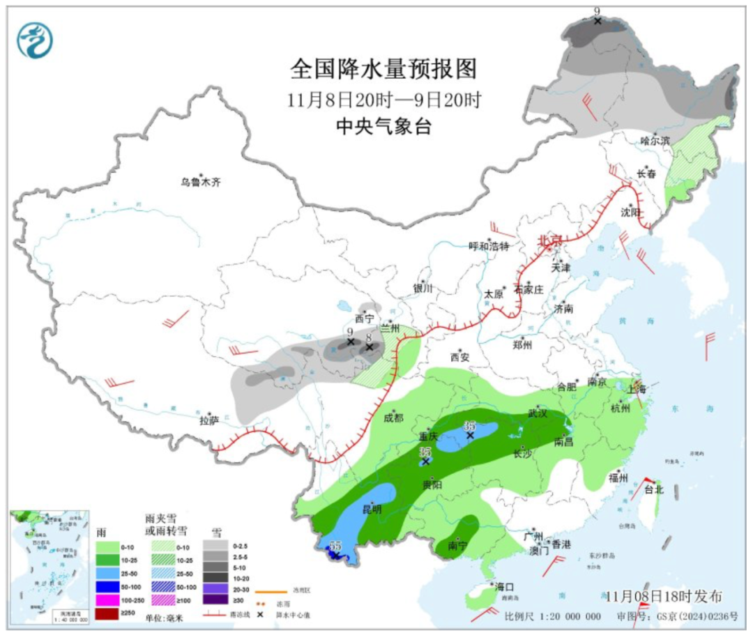 中央气象台预计,8日20时至9日20时,内蒙古东部、东北地区东部和北部、西藏东北部、西北地区中部、川西高原北部等地部分地区有小雪或雨夹雪,其中,内蒙古东北部、黑龙江北部、青海南部、甘肃南部等地部分地区有中雪,局地大雪。江汉南部、江南北部、重庆中部、西南地区南部等地部分地区有中到大雨,其中,云南西南部等地局地有暴雨。