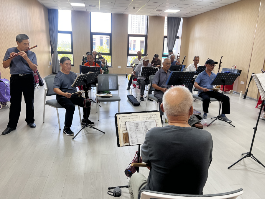 万福社区老年康养活动中心演艺厅内二胡声悠扬,74岁的唐志成与老友们正为重阳节汇演认真排练;二楼舞蹈室内,居民们跟随物业人员练习手指舞;棋牌区则传来清脆的落子声与欢笑声……