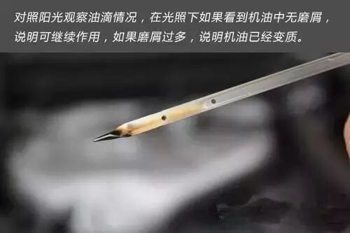 取出机油尺高举观察,在光照之下观察机油油滴,可清晰看到油滴中无磨屑末的为良好不需要更换。如果磨屑末多,甚至浑浊,应该更换。