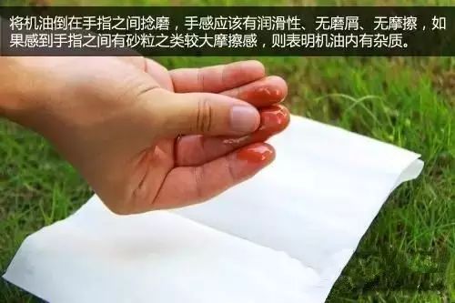 取出少量的旧机油用手指反复研磨,质量好的手感有润滑性、磨屑少、无摩擦感。如感到有杂质,黏性差,甚至发涩,应该更换。