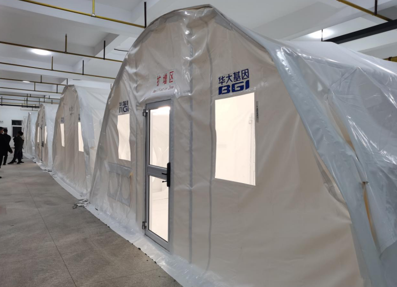 该实验室项目具体由6座气膜方舱实验室组成,按照两条核酸检测生产线设计,包括1个样本处理区、1个试剂准备区、2个样本制备区、2个核酸扩增区,配置设备1000余套。