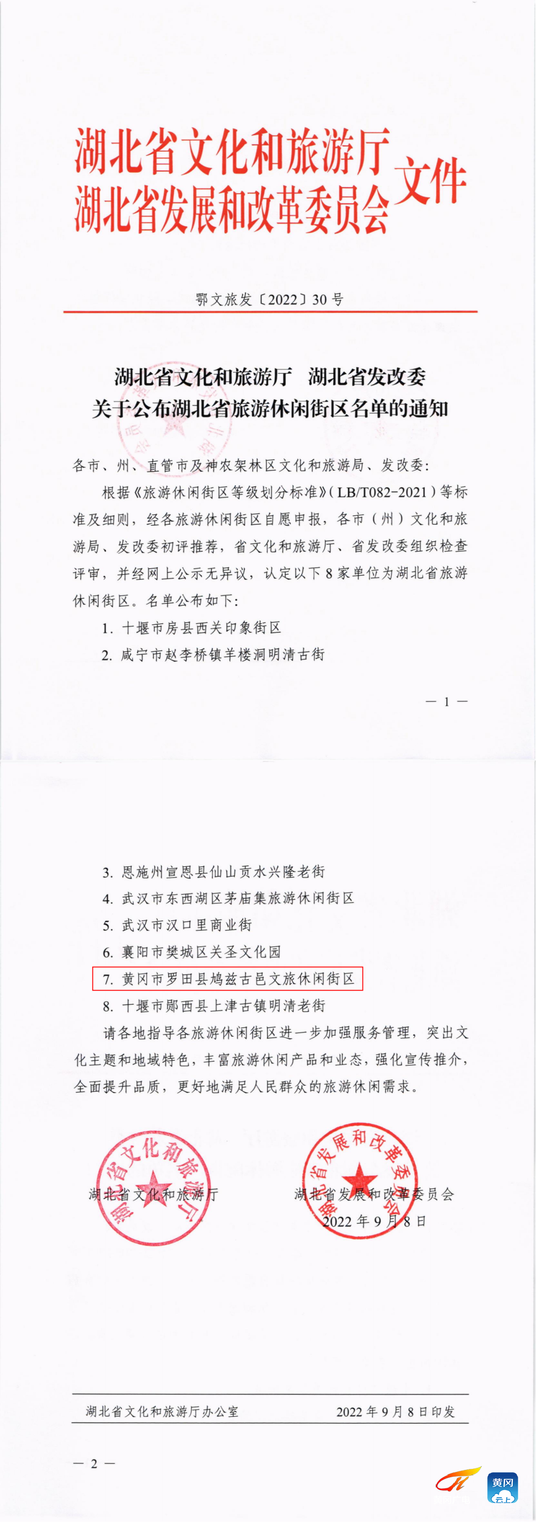 9月8日,湖北省文化和旅游厅官网公布2022年省级旅游休闲街区认定名单。根据《旅游休闲街区等级划分标准》(LB/T082-2021)等标准及细则,经各旅游休闲街区自愿申报,各市(州)文化和旅游局、发改委初评推荐,省文化和旅游厅、省发改委组织检查评审,并经网上公示无异议,认定8家单位为湖北省旅游休闲街区,黄冈市罗田县鸠兹古邑文旅休闲街区位列其中。