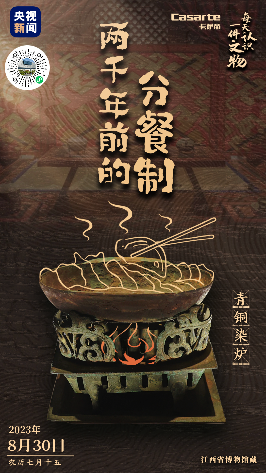 央视新闻联合全国博物馆推出文博科普产品《文博日历》,每天带您认识一件文物。青铜染炉由盘、炉、耳杯三部分组成,多发现于西汉中晚期的墓葬中,在湖南、河南、山西、江西等地都有出土。西汉贵族宴饮时,先在耳杯中放好调料,然后通过下边的炉子加热,最后把煮过的肉放进耳杯里,使肉味和调料味相互融合,堪称是西汉人的“小火锅”~