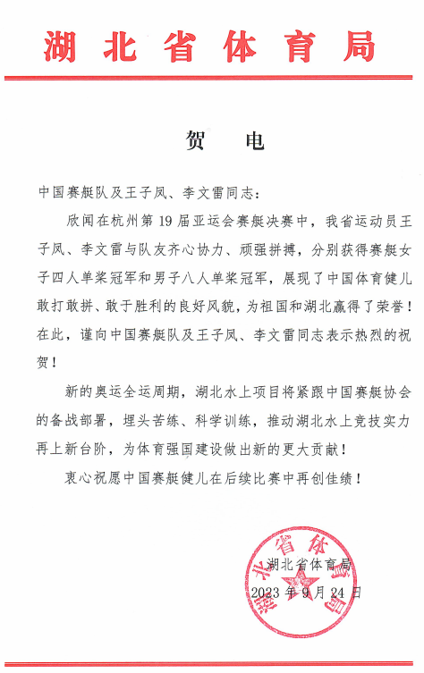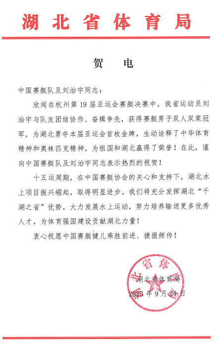 刘治宇夺得赛艇男子双人双桨冠军王子凤、李文雷分别获得赛艇女子四人单桨冠军和男子八人单桨冠军湖北省体育局为他们发来贺电!