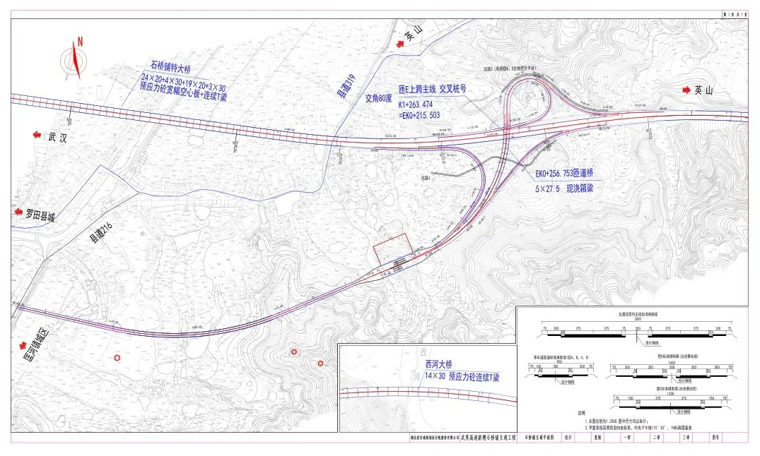 武英高速石桥铺互通出入口位于罗田县匡河镇石桥铺村深斗湾,项目采用单喇叭口互通立体交叉设计,五条匝道,总里程4.1公里,占地15公顷,概算投资1.48亿元。