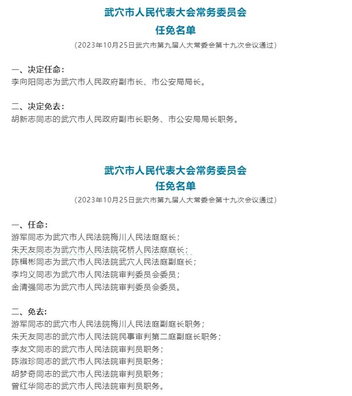 2023年10月25日武穴市第九届人大常委会第十九次会议通过。决定任命:李向阳同志为武穴市人民政府副市长、市公安局局长。决定免去:胡新志同志的武穴市人民政府副市长职务、市公安局局长职务。