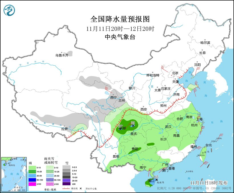中央气象台预计,11日20时至12日20时,新疆沿天山地区、西藏中部和东部、青海北部和东南部、甘肃中南部和河西、山东半岛、川西高原北部等地部分地区有小雪或雨夹雪。四川盆地、贵州南部、湖南西南部、海南岛等地部分地区有中到大雨,局地有暴雨。