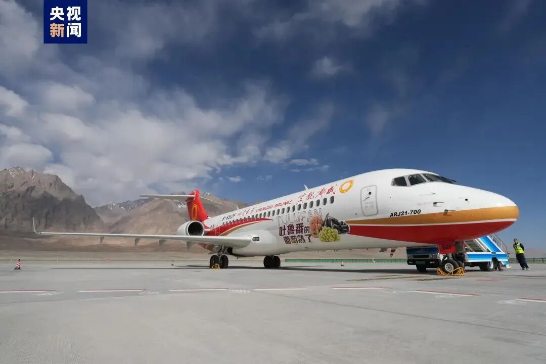 成都航空ARJ21飞机从新疆喀什徕宁国际机场起飞,安全抵达海拔3258.4米的新疆塔什库尔干红其拉甫机场,标志着国产商用飞机首条高高原定期航线成功开航。